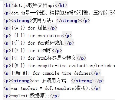 dot.js是一个短小精悍的js模板引擎,压缩版仅有4K大小官网:http://olado.github.com/doT下载地址:立即下载dot.jsdoT.js特点是快,小,教程ServerHtmlsavh