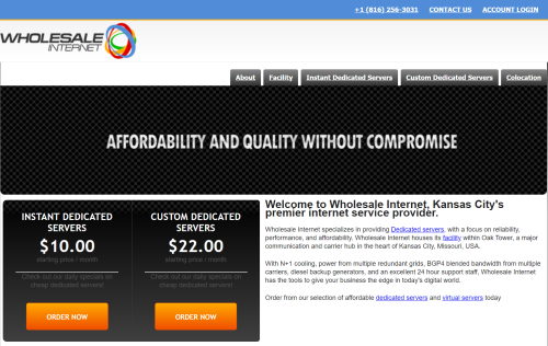 介绍WholeSaleInternet成立于1999年,总部和数据中心都位于美国密苏里州堪萨斯城,主要经营服务器托管租用。其服务器有两种,一种快速部署服务器,一种是客户定制服务独服美国savh