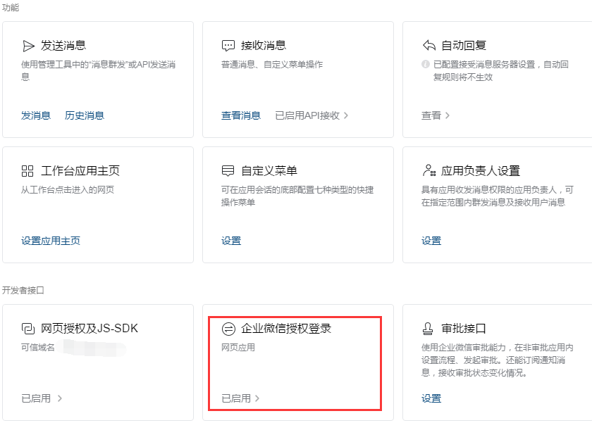 1. 按照官方要求,登陆企业管理端后台->应用于小程序->需要开启的自建应用->进入应用并点击 “企业微信授权登录"