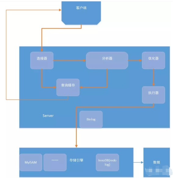 Server层:主要包括连接器、查询缓存、分析器、优化器、执行器等,所有跨存储引擎的功能都在这一层实现,比如存储过程、触发器、视图,函数等,还有一个通用的日志模块 binglog日志模块。