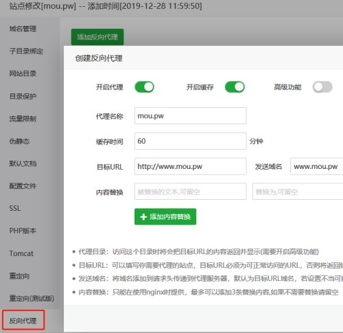 选择修改站点:反向代理 -- 添加反向代理,如下图: