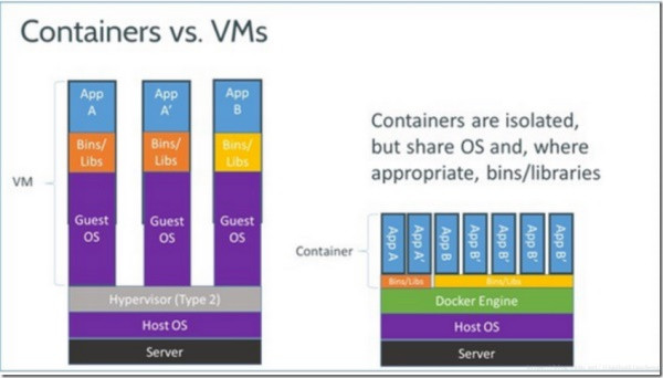Container(Docker容器),在宿主机器、宿主机器操作系统上创建Docker引擎,在引擎的基础上再安装应用。