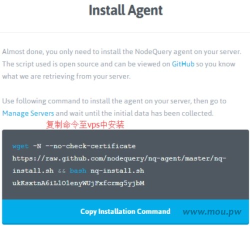 3. 按提示,将复制文本框中的命令至vps执行安装,成功后提示