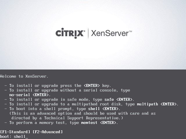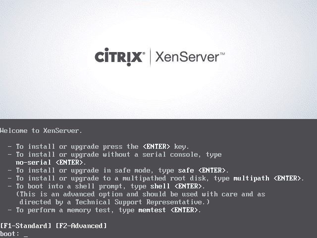 在安装XenServer之前,要在主机BIOS中打开Inter-VT功能,将BIOS设置为光驱启动,然后放入XenServer光盘,引导界面出现XenServer安装界面,选择F1进入标准安装。