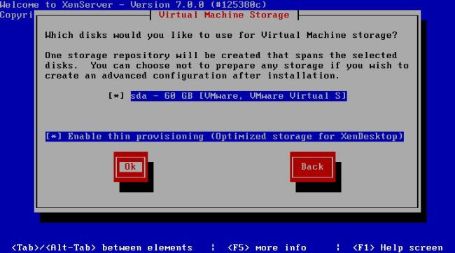 11、空格键选定 磁盘 及Enable thin provisioning(为XenDesktop部署做优化)后 OK 继续