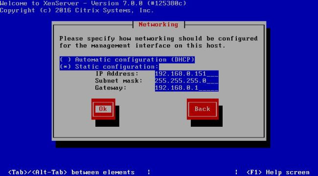 16、定义管理网络IP地址,我这里选择手动配置IP,输入IP、 掩码、 网关;如果你的环境有多张网卡,则在此页面前有一个选择一个网卡作为管理网口的选项