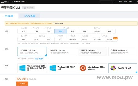 目前腾讯云服务器CVM拥有广州、上海、北京、香港、新加坡、多伦多几个机房,然后可以根据不同的配置选择机型,最低是1G内存起步,20GB硬盘。