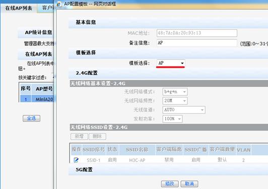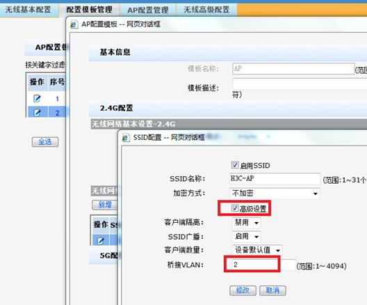 4、配置相应模板,SSID桥接到VLAN 2。页面向导:AP管理→在线AP管理→在线AP列表