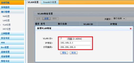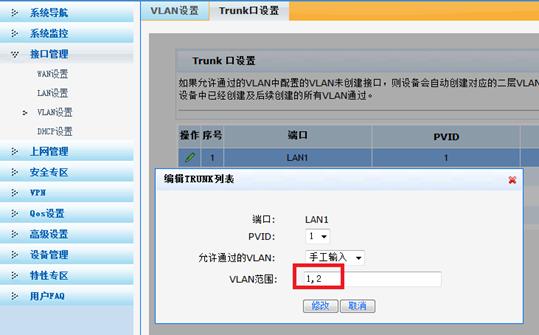 2、配置网关路由器与交换机相连的接口允许VLAN 报文通过。页面向导:接口管理→VLAN设置→Trunk口设置